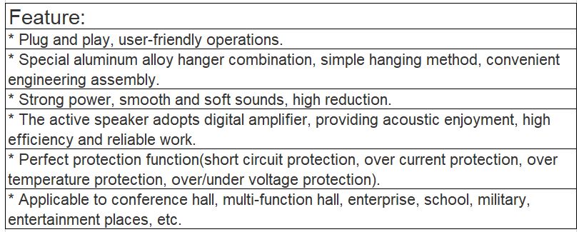 The digital amplifier and loudspeaker that make up an active linear array speaker have great sound quality, high efficiency sound output, faultless protection, and superb electromagnetic compatibility. It uses the widely accepted standard 220VAC power supply voltage (but it also supports custom input power supply voltage). The advantages of the hoisting installation and linear array design include compact combination, lightweight, and simple technical assembly. The speaker's coverage area may be adjusted from 0 to 11 degrees.